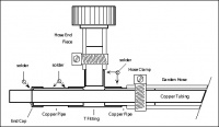 L'illustration 159 montre un exemple pour la construction des raccords à contre-courant et le montage de la tuyauterie en cuivre à l'intérieur du tuyau d'arrosage. Les pièces sont en 12mm standard, en cuivre rigide, un embout et un raccord en T. Les pièces sont soudées ensemble en utilisant de la soudure à l'argent sans plomb et un chalumeau au propane. Les extrémités du tuyau d'arrosage sont coupées et maintenues en place par les colliers de serrage sur le T. Le tube de cuivre diamètre 10mm où circule le moût sort à travers le capuchon d'extrémité par un trou de diamètre 12mm. L'ouverture pour le tube est scellée par un cordon de soudure autour du trou.